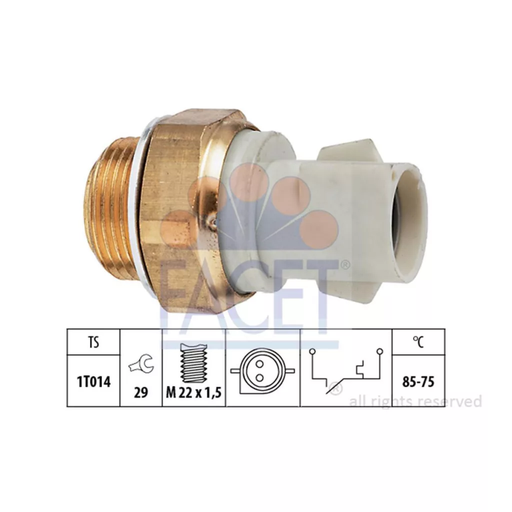 A FACET 7.5130 hűtőfolyadék hőmérséklet-érzékelő megbízható alkatrész a motor hőháztartásának pontos szabályozásához. Feladata, hogy az üzemi hőmérséklet elérésekor automatikusan kapcsolja a hűtőventilátort, így előzve meg a motor túlmelegedését.