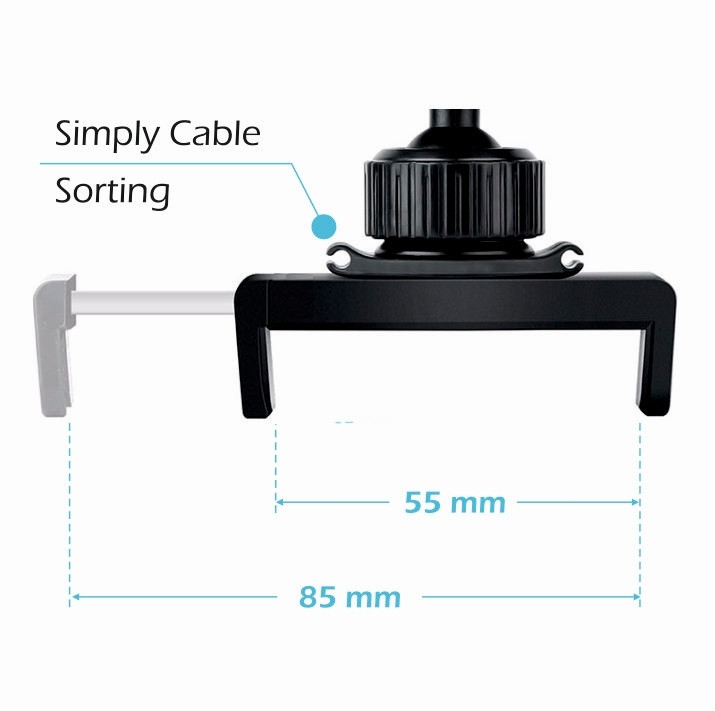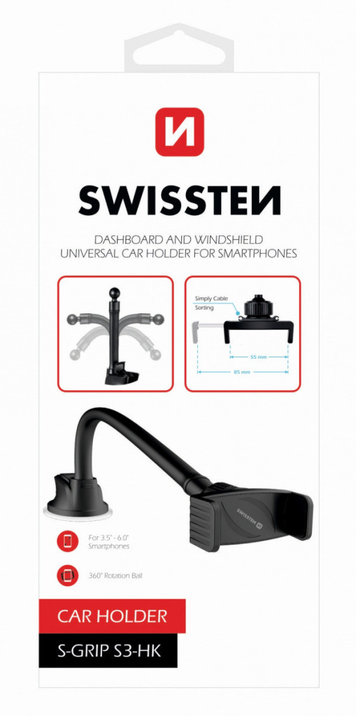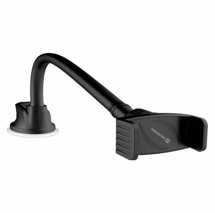 Swissten univerzális telefontartó hosszú, 36 cm-es hajlítható karral és erős tapadókoronggal. Könnyedén rögzíthető szélvédőre vagy műszerfalra, stabil tartást biztosít minden szabványos okostelefonhoz. Ideális kényelmes pozíció beállításához utazás közben.