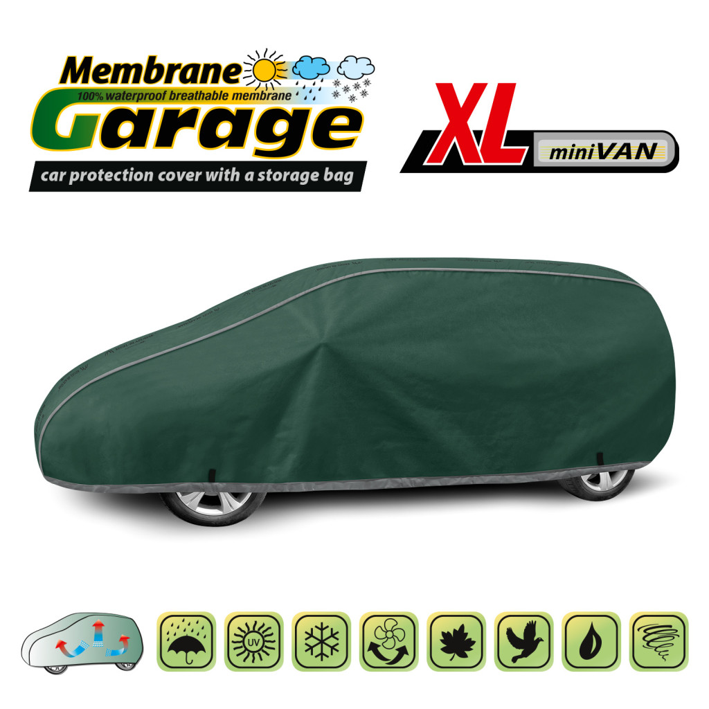 Membrane Garage autóponyva a Kegel-Błażusiak legfejlettebb védőponyvája, amely 4 rétegű, extra vízálló szerkezetének és dupla vízzáró rétegének köszönhetően még a legintenzívebb esőzések esetén is teljesen szárazon tartja járművét. A vastag, erős és tartós anyag egész évben hatékony védelmet nyújt az időjárás és a szennyeződések ellen.