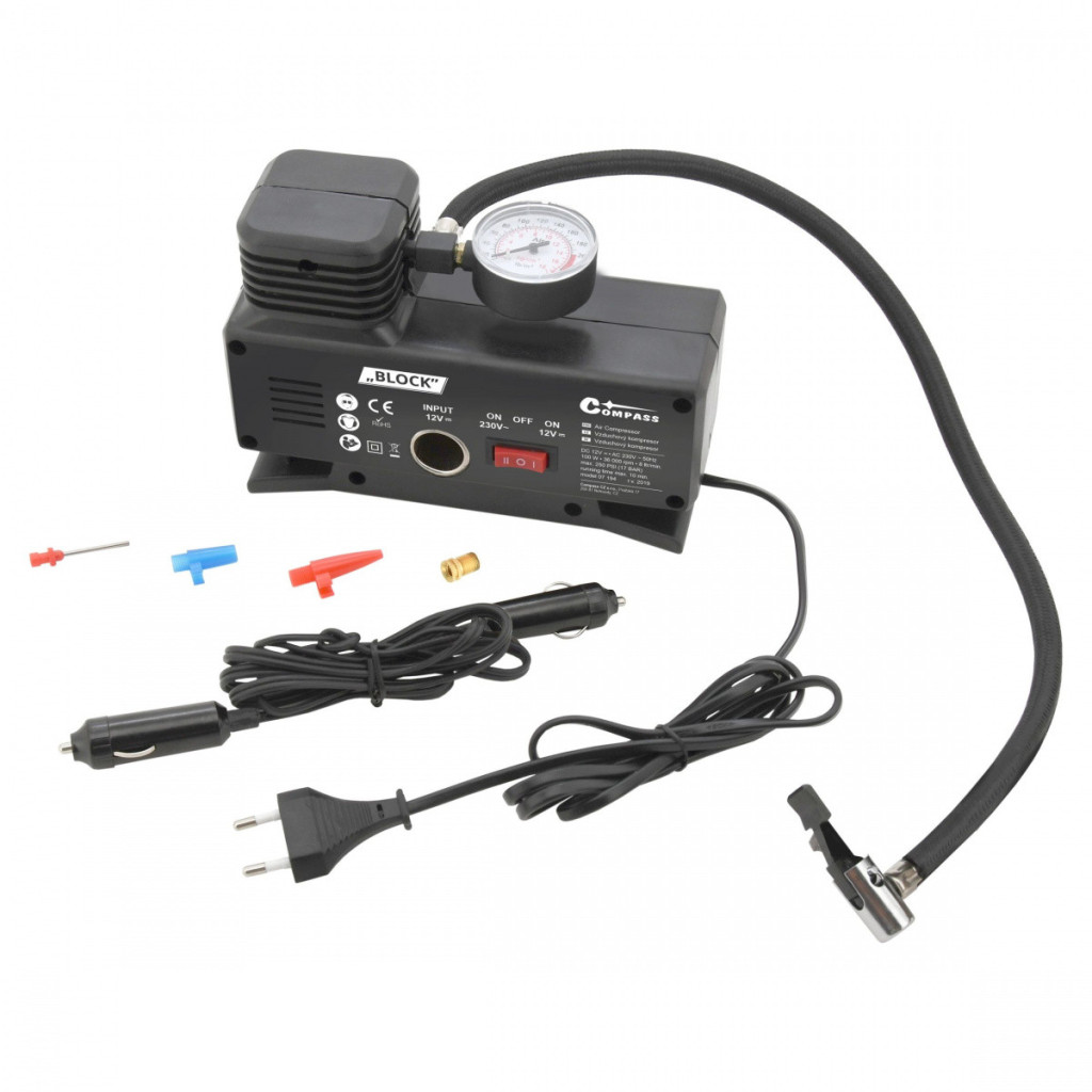 A kompresszor alkalmas személygépkocsik, motorkerékpárok, kerékpárok vagy babakocsik gumiabroncsainak felfújására. A csomag további adaptereket tartalmaz különféle felhasználási módokhoz (labdák, matracok, medencék stb. felfújásához).