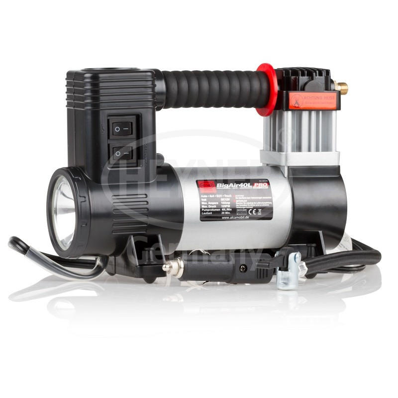 A HEYNER BigAir 12V-os autós kompresszor nagy teljesítményű, percenként 40 liter levegő szállítására képes, így gyors és hatékony felfújást biztosít személyautók, motorkerékpárok, kerékpárok és más felfújható eszközök számára. Stabil fémházzal, hosszú kábel- és tömlőhosszal rendelkezik a kényelmes használat érdekében. Beépített nyomásmérővel ellátott, így a kívánt nyomás pontosan beállítható. Kompakt kialakításának köszönhetően könnyen szállítható és tárolható az autóban.