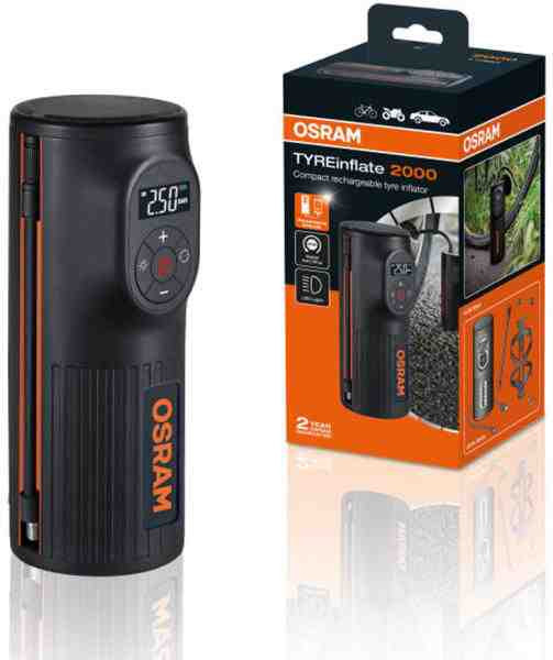 Az Osram TYREinflate 2000 egy kompakt, újratölthető gumiabroncs légkompresszor, amely ideális megoldás autója, kerékpárja vagy egyéb járművei gumiabroncsainak gyors és egyszerű felfújására. A beépített 5200 mAh akkumulátor lehetővé teszi a vezeték nélküli használatot, így nem szükséges 12V-os hálózati csatlakozó. A digitális, háttérvilágítású kijelző segítségével könnyedén beállíthatja a kívánt nyomást, amelyet a kompresszor automatikusan elér, majd leáll. A készülék maximális nyomása 120 PSI (8,3 bar), és különböző adapterekkel rendelkezik, így többféle járműhöz és eszközhöz is használható.
