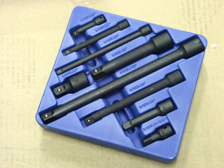9 darabos légkulcsszár készlet 1/4", 3/8" és 1/2" méretekben. Kompatibilis pneumatikus szerszámokkal. Típus: IE-2349.