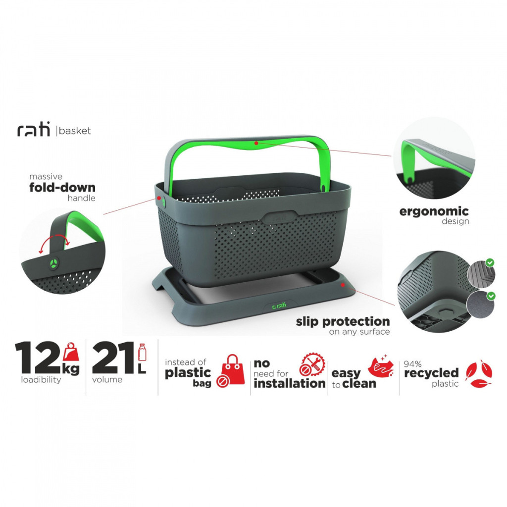 A kosár térfogata megegyezik a hagyományos összecsukható autós rendszerezőkével, és a Rati Basket segítségével nem pazarolja az időt az össze- és kibontásra.