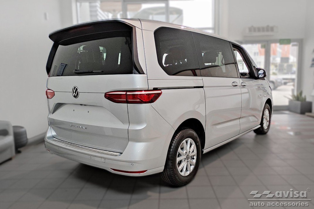 Volkswagen|Multivan T7|2021-|A rozsdamentes acélból készült védő díszléc. Megvédi a lökhárítót és a csomagtér peremét a karcolásoktól. Ezek a csomagtartó védőcsíkok pontosan passzolnak a Volkswagen Multivan T7 2021- formájához.