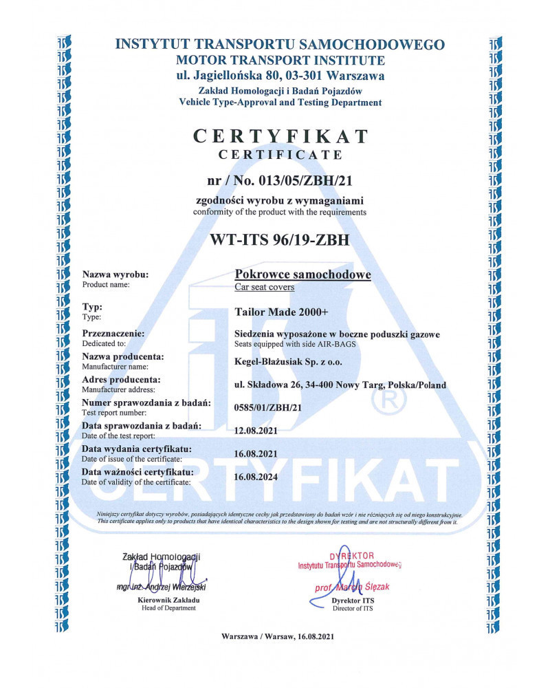 - Biztonságos - AirBag oldallégzsákokkal felszerelt ülésekhez igazítva, amit a Gépjárműközlekedési Intézet tanúsítványa és tesztjei igazolnak