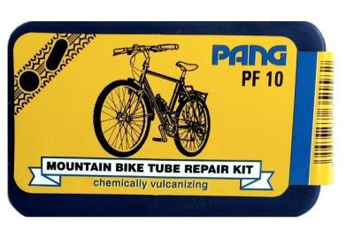 Defektjavító készlet PF10 típusú pang gumielemekkel, kifejezetten kerékpárokhoz. Minden szükséges eszközt tartalmaz a gyors javításhoz.