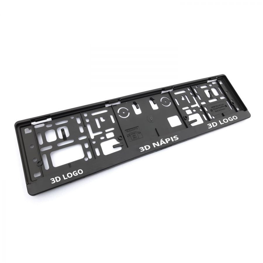 Fekete műanyag rendszámtábla tartó. 3D logókkal és feliratokkal. Univerzális rögzítéshez szükséges furatokkal.