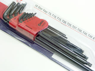 Torxkulcs készlet lyukas (biztonsági) kivitelben, alkalmas speciális csavarokhoz.