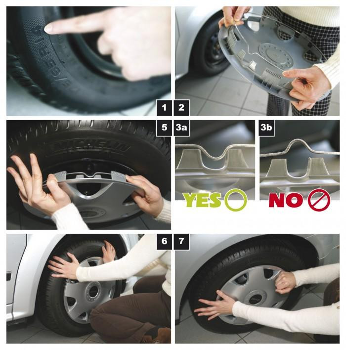 A dísztárcsák felszerelése egyszerű és nem igényel szerszámokat . A dísztárcsákon lévő reteszek "bepattannak" a felnikbe. A dísztárcsák külső oldalán egy vastag acélhuzal nyomja a reteszeket a felnikhez, és rögzíti a dísztárcsákat a kiesés ellen (lásd a 2. képet a fotógalériában).