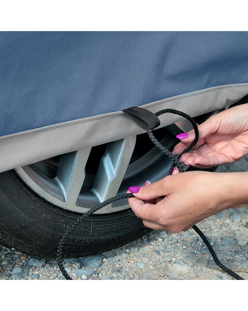 Szerelése: A huzatot a tiszta és száraz autóra tegye rá, úgy, hogy a szürke oldala befele nézzen. Utána maximálisan húzza össze a zsinórt, és jól kösse össze. Ne használja a belső oldalán piszkos huzatot.