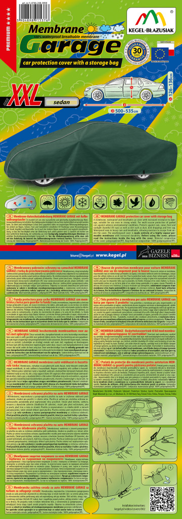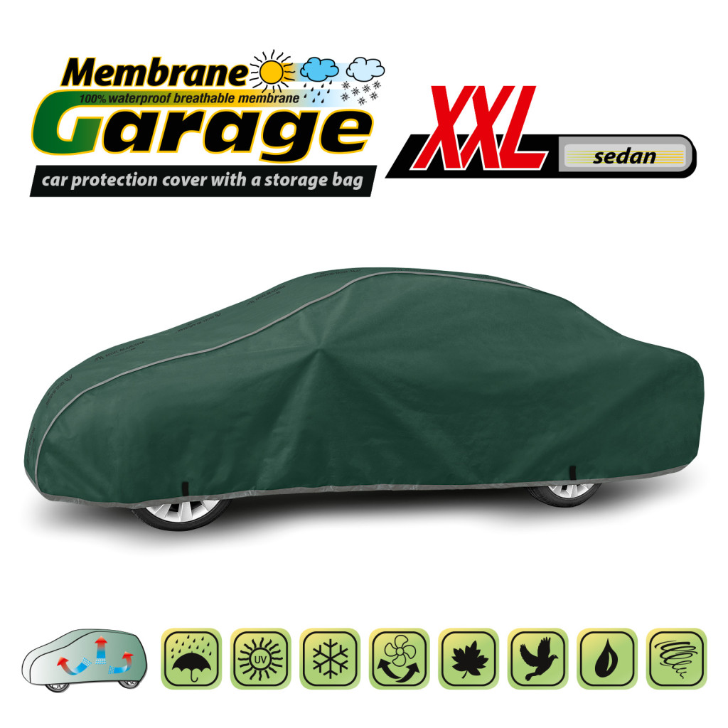 Membrane Garage autóponyva a Kegel-Błażusiak legfejlettebb védőponyvája, amely 4 rétegű, extra vízálló szerkezetének és dupla vízzáró rétegének köszönhetően még a legintenzívebb esőzések esetén is teljesen szárazon tartja járművét. A vastag, erős és tartós anyag egész évben hatékony védelmet nyújt az időjárás és a szennyeződések ellen.