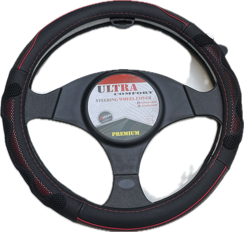 Valódi bőr kormányvédő 38cm fekete/piros (5002R) autolife
