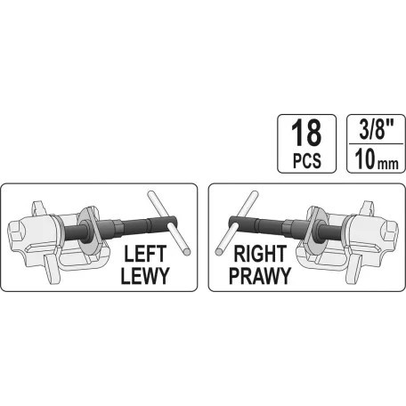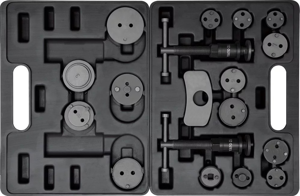 YT-0682 jelű, 18 darabos féknyereg visszanyomó készlet tárcsafékes járművekhez. Alkalmas a fékdugattyúk szakszerű visszanyomására és visszatekerésére fékbetétcsere vagy fékjavítás során.