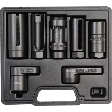 YT-1751 cikkszámú, 7 darabos dugókulcs készlet lambda szondák és injektorok szereléséhez. A készlet 1/2" és 3/8" meghajtású kulcsokkal használható, így megkönnyíti a nehezen hozzáférhető alkatrészek ki- és beszerelését. Kifejezetten autószerelési munkákhoz készült szerszámkészlet, amely praktikus megoldást nyújt műhelyben vagy otthoni javítások során.