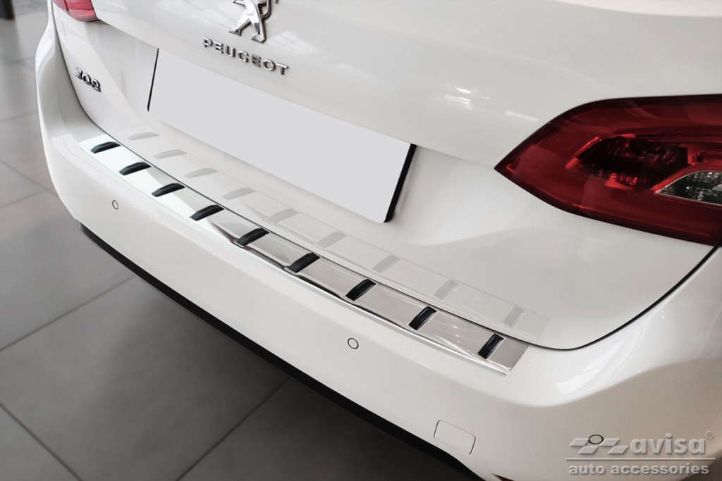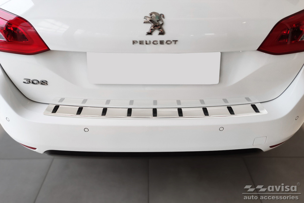 Peugeot|308|2013-2021|0,8 mm vastag rozsdamentes acél védőcsík műanyag bordázattal. Védelem a lökhárító és a csomagtér peremének karcolódása ellen.