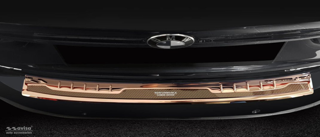 Hátsó lökhárítóra készült védőcsík BMW X1-hoz réz, acél és karbon kombinációjából.